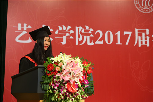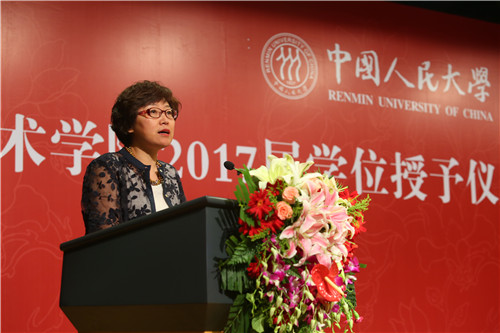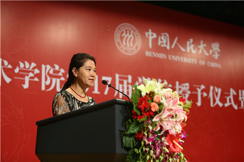 艺术学系马躏非副教授作为教师代表发言,她对毕业生们在校期间取得的各方面成绩表示祝贺与肯定,同时表达了对同学们的深切期许,在临别之际赠送毕业生寄语,期望同学们永葆“三心”:感激之心、敬畏之心、恻隐之心,并做一个诚实、勤劳、成熟的人,做一个对社会有一己贡献的人,人民大学男人天堂
