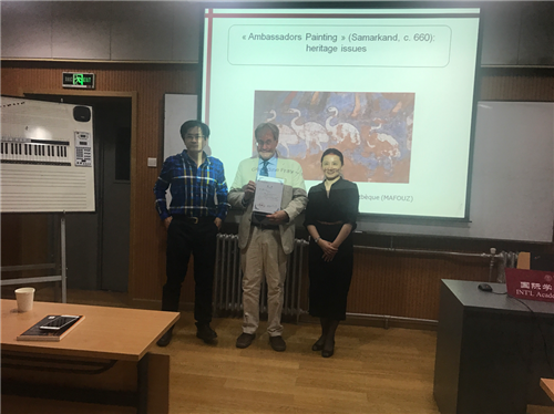 院长丁方教授出席了本次讲座。讲座内容分为两大部分:通往大使厅壁画、体验喀拉汗王朝壁画。讲座以挖掘出土的壁画内容为切入点,介绍了当时现场考察的现状和保存修复这些壁画的信息。此次讲座作为国际学术大师讲堂,我们还有幸的请到了科研处的副处长许勤华教授,许勤华教授介绍了国际大师讲堂和专家授予的情况。