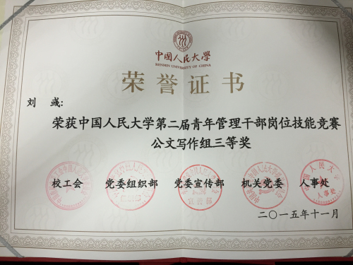 第二届青年管理干部岗位技能竞赛中荣获综合组三等奖。本次比赛由校工会、党委组织部、党委宣传部、人事处和机关党委共同举办。