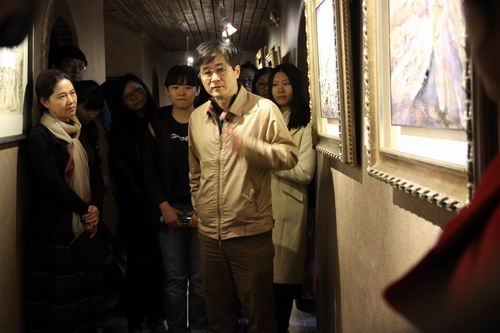 在丁方院长动情的讲解下,同学们参观了主题为“神圣山水”的展览。丁方院长讲到,学习艺术的同学要想创作好作品必须有大量的平时积累和思考,就像冰山一样,别人看到的只是浮出水面的一角,而冰山下面还有非常强大的根基。若没有经过艰苦的磨砺,做出的作品便不能称之为真正的艺术。丁方院长结合自己年轻时的奋斗经历,谈到了如何从年少迷茫地学习工笔画,到走向大西北感受自然的力量,并将其与自己的艺术追求结合,逐渐形成了自己的绘画风格。同学们听了深受启发和鼓舞。今年正值世界反法西斯战争胜利70周年,同学们同时参观了法兰西岁月纪念馆。馆内陈列着珍贵的历史图片、文献与文物。“五四”运动前后,一大批有志爱国青年远渡重洋,赴法国勤工俭学,研究社会主义思潮和马克思主义。他们中许多人后来成为了党的中坚力量,周恩来、朱德、陈毅、聂荣臻、邓小平等则成长为党的领导人。