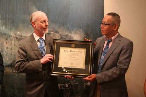 与美国肯恩大学联合主办。我院执行院长徐唯辛教授、肯恩大学常务副校长菲利普·康奈利教授、肯恩大学副校长兼教务长杰弗里·托尼博士等共同主持了闭幕式。我院设计系副教授吴文越、副教授郑晓红、绘画系讲师王水清等出席了开幕式。在开幕式上,肯恩大学常务副校长菲利普教授代表校方向徐唯辛教授颁发了肯恩大学名誉教授证书。