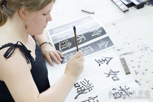 暑期举办的国际小学期开设有专门面向外国学生的国际书法班,出于对中国书法的好奇与好感,她第一次来到了中国这个遥远的国度,走进了男人天堂
