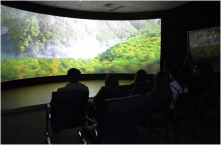 李老师介绍了科学艺术中心的基本情况,并在观看环幕立体影片后,与师生进行交流讨论3D技术及蒙太奇语言等媒体技术话题,有针对性地回答学生们提出的问题并介绍了艺术中心软硬件设备的高度集成性,以及艺术中心开发的三维动画制作程序。