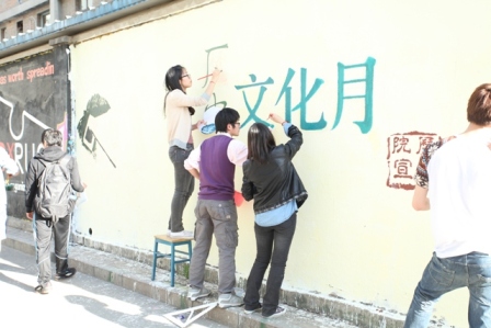2012年4月8日下午,应历史学院学生会邀请,我院青年志愿者协会的志愿者以“艺术顾问”的身份,指导和帮助其进行“历史文化月”涂鸦墙的绘制工作。