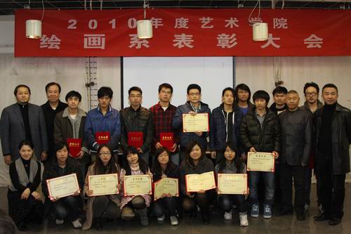 黄老师首先宣布2010年度绘画专业汇看评奖学生名单,油画专业、中国书画专业和基础部共有44名同学获得各类奖项,院系领导向获奖同学颁发荣誉证书和奖品速写本一本。