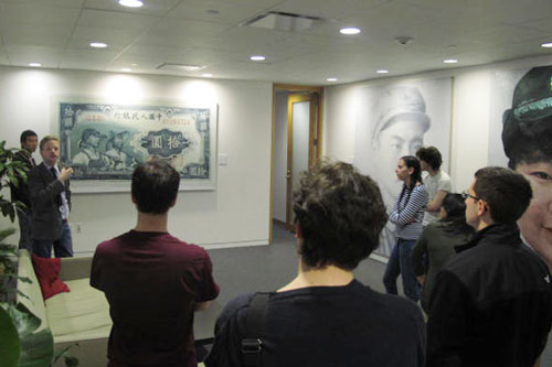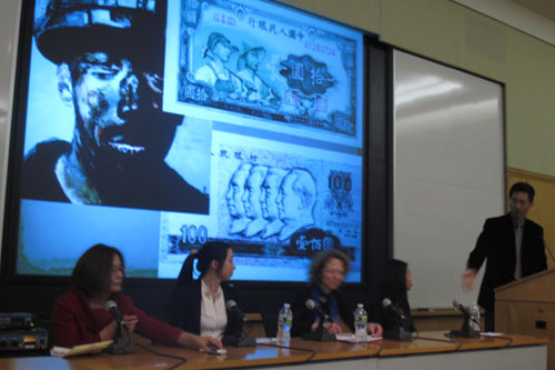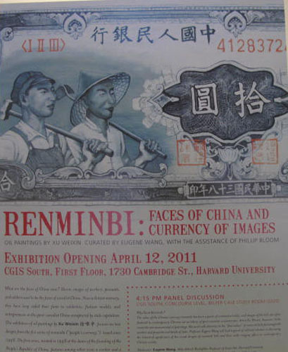 展览开幕式前,该中心还在学术报告厅举办了相关的学术研讨会。哈佛大学艺术系艺术史教授汪悦进先生作为此次展览的策展人主持了研讨会。他介绍说,艺术家徐唯辛教授的作品以人民币上人物形象的演变作为切入点,作品包括第一版人民币及设计者肖像、第四版人民币,还有普通的当代工农兵的肖像,构成了中国形象与人民币流通中的关系。汪悦进认为,徐唯辛采用现代图象艺术与传统写实油画风格的结合,还有一层意义,试图在艺术作品中用新的态度来面对消费文化现象,作者用一种比较严肃的和庄严的精神与当代中国流行的波普艺术形成对比。研讨会上还以幻灯的形式介绍了徐唯辛教授近年来创作的系列中国当代人物肖象。