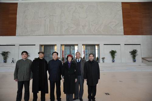 图1:国家博物馆吕章申馆长、徐悲鸿纪念馆廖静文馆长、徐庆平院长等在“愚公移山”大型浮雕前合影