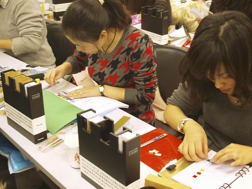 第三届色彩研究生课程班授课期间,日本TOYO INK公司为学员们提供了最新的色票(Color Finder)。学员们使用这套最新色票,在来自日本的杉山久仁彦和北畠耀老师的指导下,对色彩中的自动配色技法进行了深入的学习。众所周知,目前日本在色彩体系的建立和整体色彩研究方面仍处于世界领先地位,其色票的制作和印刷水平亦堪称一流,目前在国内同类教学中学员能使用最新的日本色票,并配合以当前日本色彩研究领域最具代表性的两位教授亲自执教,尚属首次,受到了学员的欢迎,也取得了很好的教学效果。