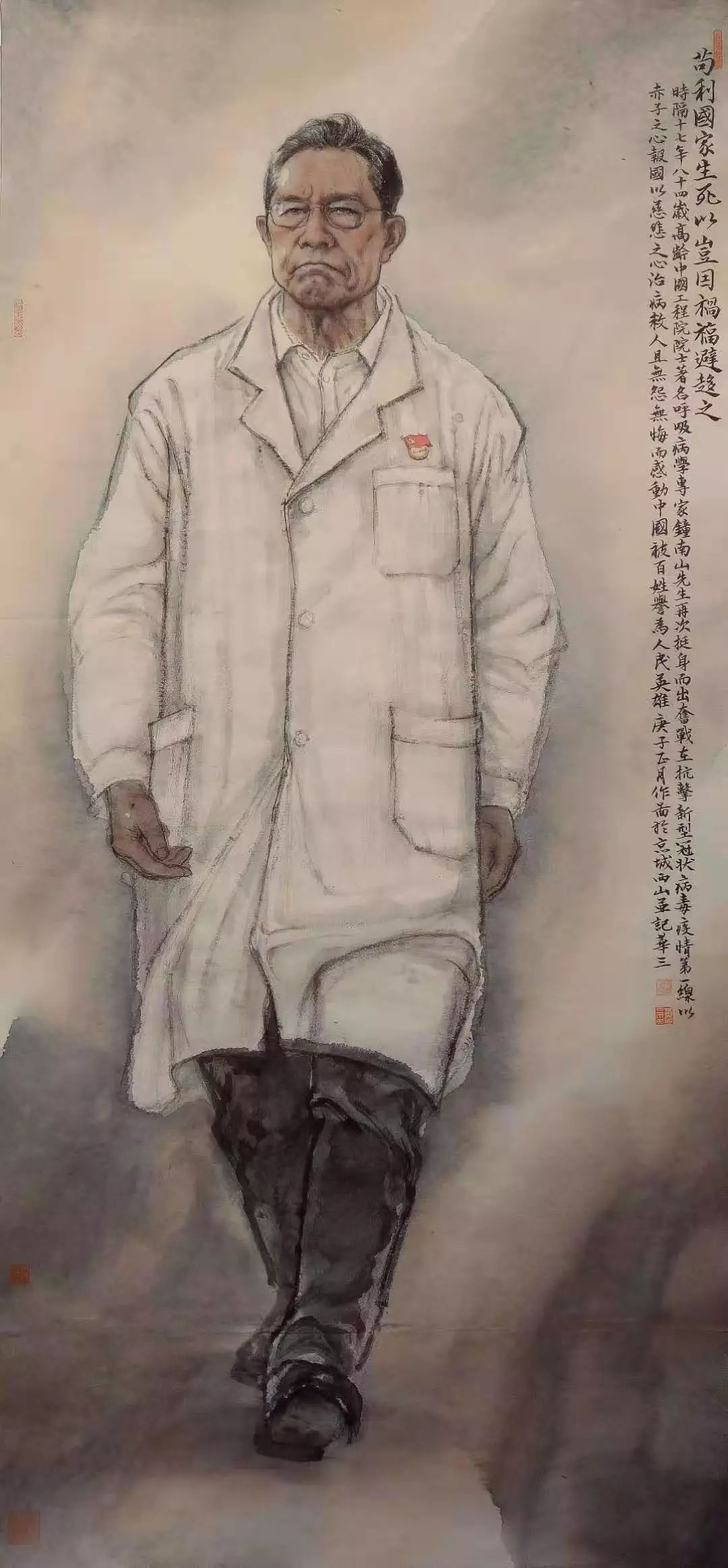作为画家,在国家面临灾难时,抗击疫情就是责任,创作就是力量,我只能拿起画笔,尽我所能地记录下当人民处于危难之时,真正挺身而出的国家栋梁,《苟利国家生死以 岂因祸福避趋之》这幅作品,以钟南山院士为原型,体现抗击疫情过程中,中华民族的脊梁与担当,体现出他果敢刚毅,有风骨、有气节、讲真话、不苟且的鲜明个性特征,记录下他逆风而行的勇敢身姿,以及给人民所带来的希望与信心。创作有感而发,是为了向民族的脊梁——钟南山院士致敬。