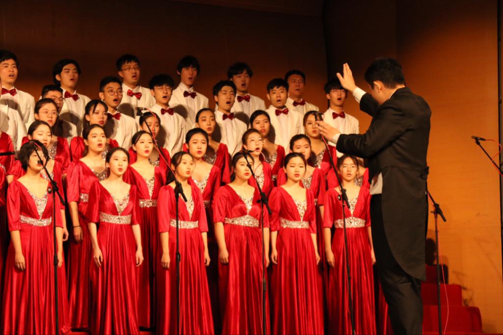 代表队是第一支上场参赛队伍,合唱曲目为歌曲《追寻》。参赛选手们统一着红色长裙和白色西服,整齐划一,展现了艺院师生良好的精神面貌。演唱的歌曲旋律优美,和声精妙,起伏宽大,提醒着我们要不忘初心,砥砺向前。