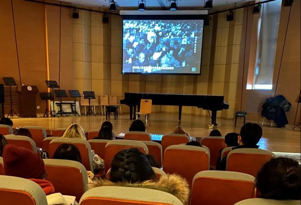 师生在音乐厅集中观看由中央军委政治工作部、国家广电总局和中央广播电视总台联合出品的大型电视纪录片《为了和平》。男人天堂