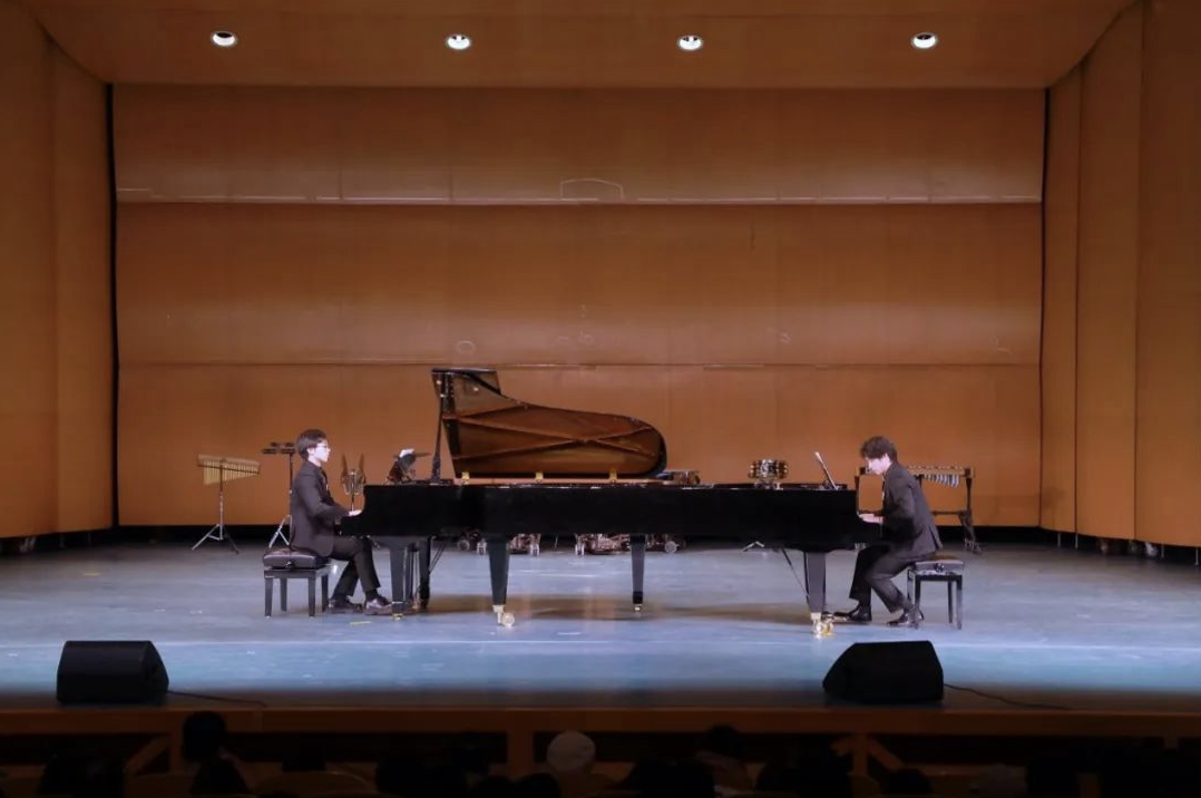 的学生颜梓超与郭雨彤联袂呈现了普罗科菲耶夫的经典双钢琴作品《辛杜瑞拉圆舞曲》,他们的双钢琴合奏仿佛是两位舞者在舞池中翩翩起舞,优雅而华丽。音符间的默契与和谐,如同精灵般的跳跃,让人陶醉其中。