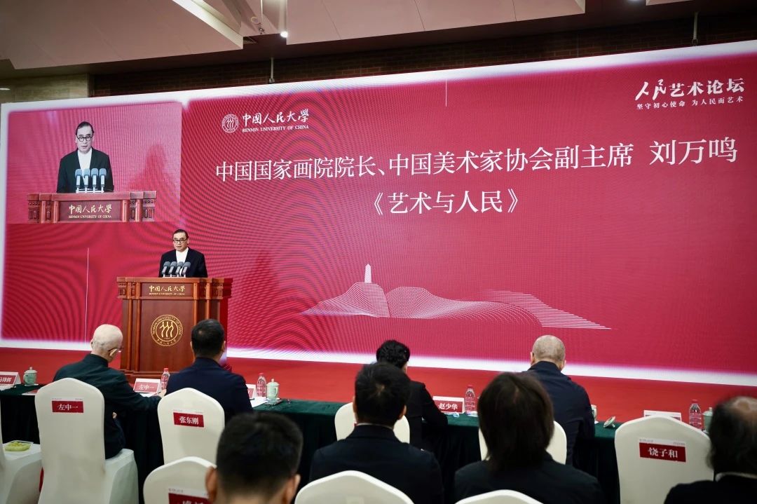 中国国家画院院长、中国美术家协会副主席刘万鸣以《艺术与人民》为题演讲,细数不同历史时期美术作品的风貌,强调艺术源于人民、艺术为了人民,探析艺术技法与创作内核辩证统一的关系,指出新中国美术发展的关键在于理论的指导,在于我们党始终坚持以人民为中心的创作理念。
