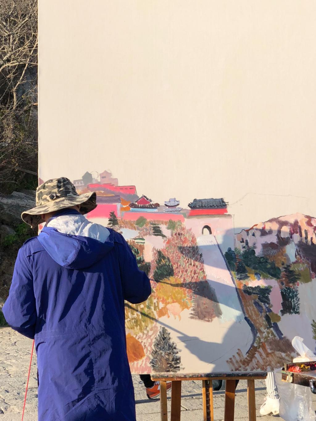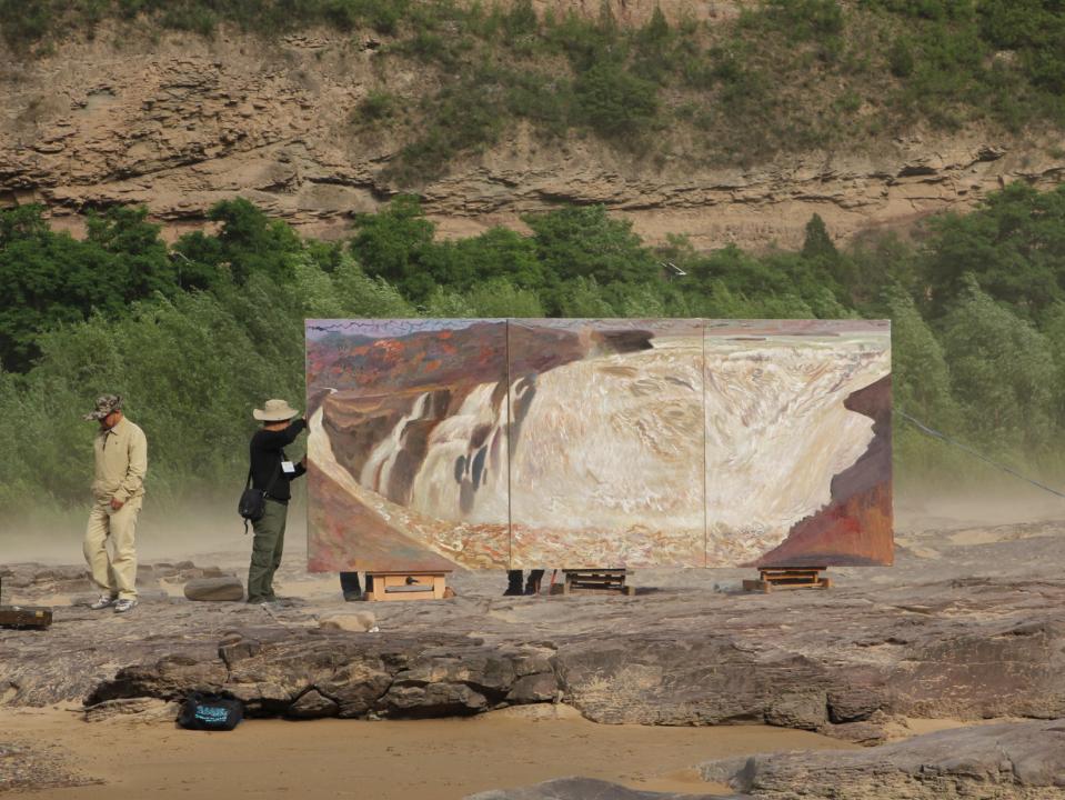 退休后,他即刻投入到《黄河》的创作之中。他认为,只有大尺幅才能表现出这条萦绕于中国文化之梦的河流的气魄,于是他从纪录片《黄河》中逐帧截取了30多个拍摄机位的画面,提前构思好想要描绘的景象,并以此为基在地图上开始标注理想的写生点。