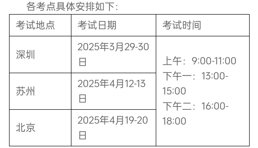 本次校考课程考试共设置北京、深圳、苏州三个考点。特别提醒:为确保考试顺利组织,每位申请人只可选择一个考试地点参加考试。提醒各位申请人切实根据自己的学习工作所在地选择!
