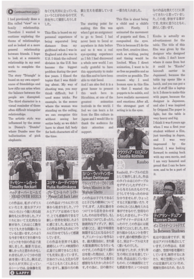2012年8月底,我院艺术设计系教师段天然实验动画作品“In Between Shadows”入围第14届广岛国际动画节竞赛单元。广岛国际动画节为全球四大动画电影节之一,1984年由国际动画协会ASIFA创立,以“和平和友爱”为电影节的创办宗旨。本次电影节有来自全球2000多部作品参赛,共有66部入选竞赛单元。