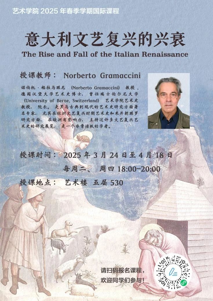 邀请文艺复兴艺术史专家诺伯托·格拉马琪尼(Norberto Gramaccini)教授来学院进行短期授课,围绕“意大利文艺复兴的兴衰”主题开展系列讲座和专题研讨。
