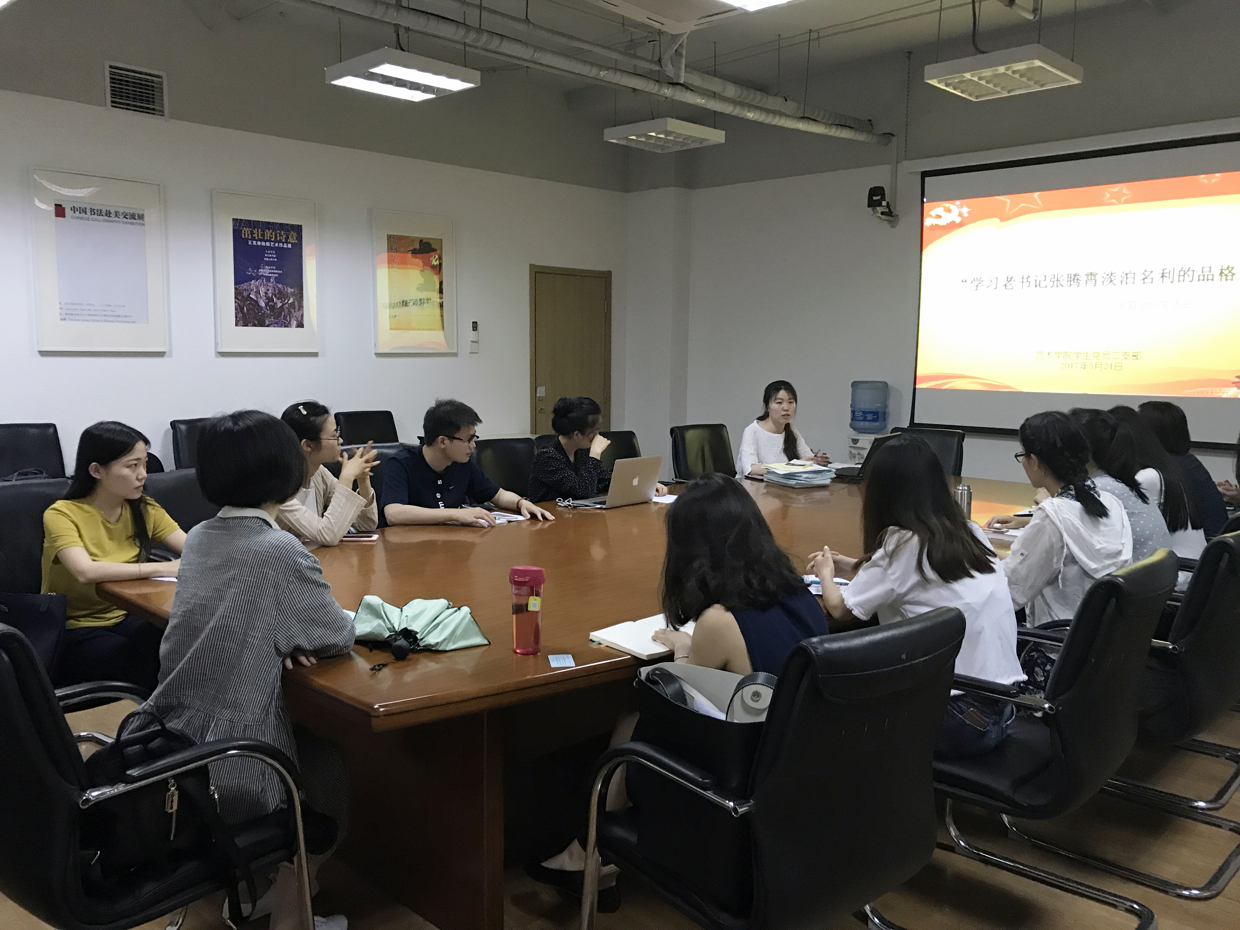 随后,通过会前自学及集中组织学习,支部同志就“张书记淡泊名利的品格”进行了充分讨论并分享了自己的学习感受。毕业生党员武珊珊表示,张腾霄老书记一生为高等教育事业的发展不断探索与实践,并注重提升学生的思想政治素质,他坚持不懈的精神与教书育人的品格深深感染了她。毕业后她也将要成为一名高中美术教师,将谨记张腾霄老书记的先进事迹和高尚品格,激励自己脚踏实地的做一名优秀的共产党员。