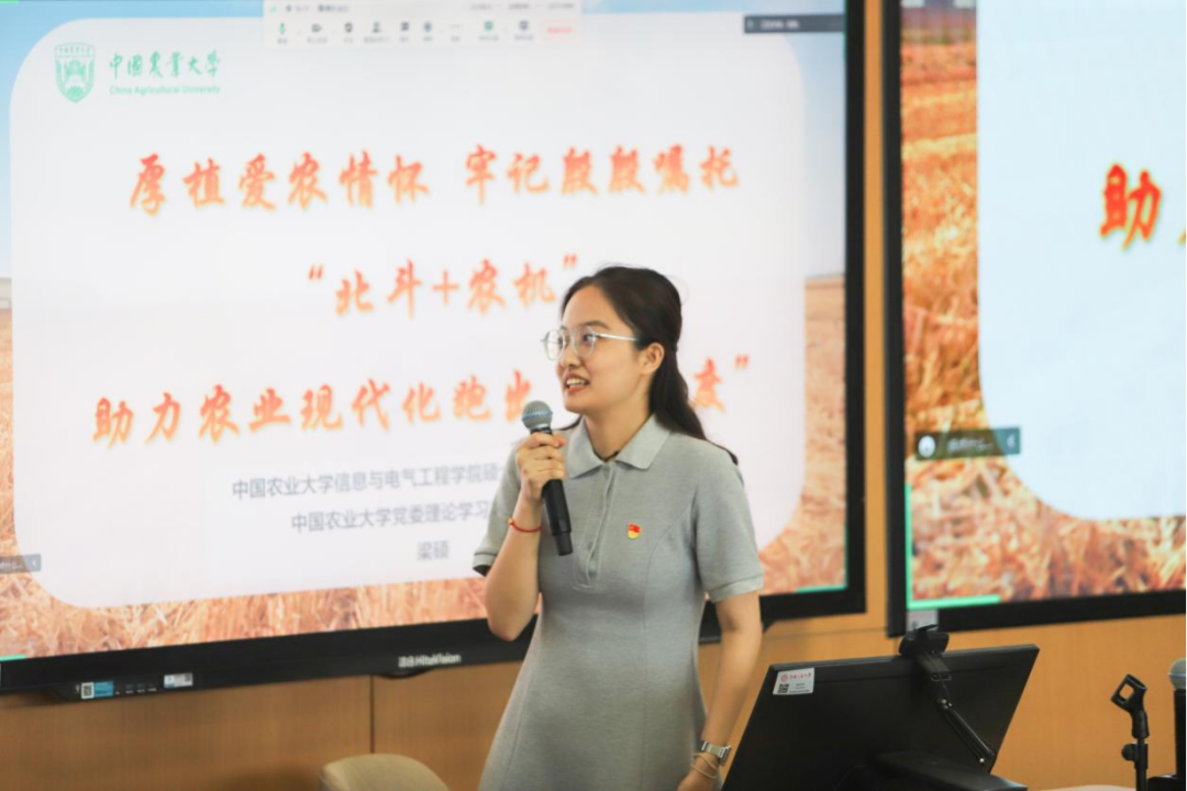 在题为《厚植农业情怀 牢记殷殷嘱托 “北斗+农机”助力农业现代化跑出“加速度”》的主题宣讲中,梁硕表示:中农北斗团队师生数十年来在“北斗+农机”领域的辛勤耕耘只是一代一代,千千万万的农大人的缩影,薪火相传的红色基因始终流淌在每一位农大人的身上,“自找苦吃”是每一位农大人真实的精神写照,我们用实际行动不断践行着“厚植爱农情怀,练就兴农本领”的青春誓言,作为农大学子,我们将不忘“强国先强农,农大作先锋”的使命与担当,不断坚定农业报国志向、农业强国信念,在加快推进农业农村现代化、推进中国式现代化、推进中华民族伟大复兴的不懈奋斗中闪耀光芒!