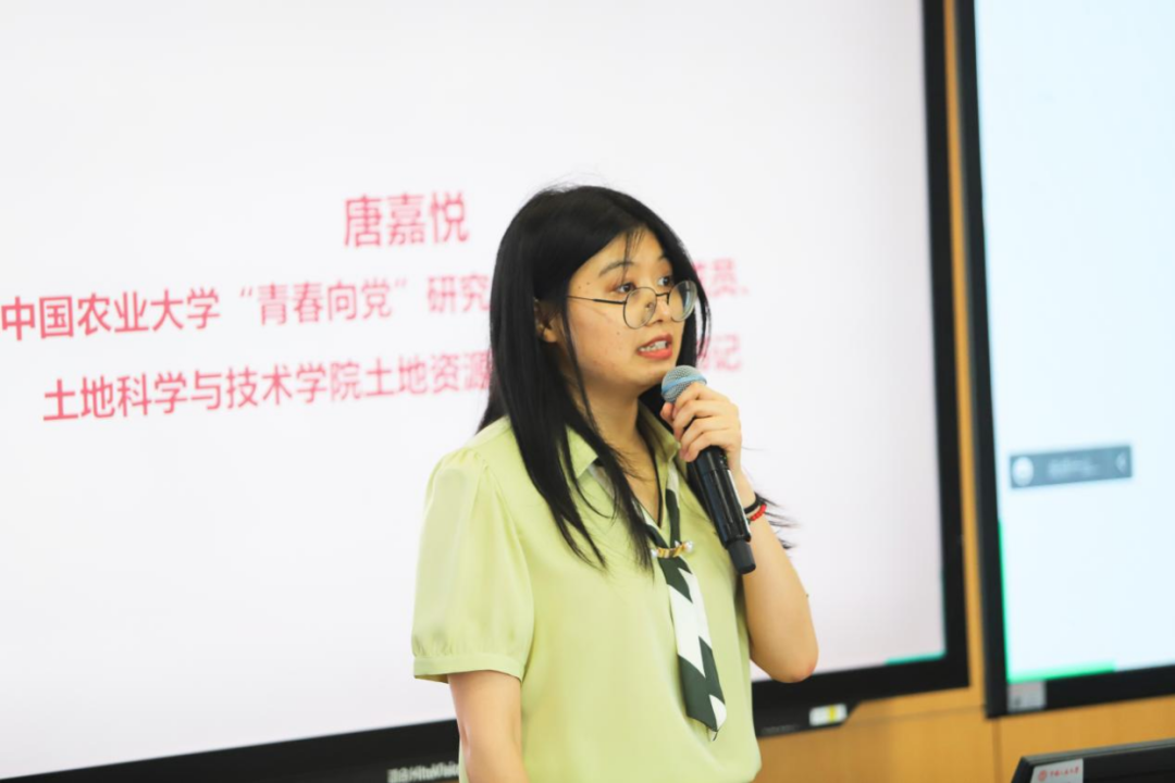 设计系学生第二党支部原书记赵乾、设计系学生第一党支部原书记赵玉婷,中国农业大学信息与电气工程学院硕士223党支部书记梁硕、土地科学与技术学院土地资源系硕士党支部书记唐嘉悦、资源与环境学院本科生应用气象学党支部书记田浩良,先后做了题为《扎根基层践行服务意识,躬耕社区助力学生成人成才》《党建引领艺术振兴乡村》《服务乡村,葛家巨变》《厚植爱农情怀,牢记殷殷嘱托,“北斗+农机”助力农业现代化跑出“加速度”》《牢记嘱托,保护“耕地中的大熊猫”助力乡村振兴》《科技小院时代精神赋能乡村振兴伟大实践——结合学院及支部工作》的主题宣讲。