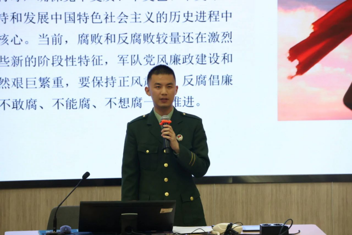 首先,延河先锋国防宣讲团吴铮同志进行了主题为《新时代人民军队的纪律建设与人才建设》的宣讲。宣讲围绕“永葆本色守初心——坚定不移正风肃纪、反腐惩恶”和“强军之道,要在得人——打造高素质、专业化新型军事人才方阵”两部分内容展开。吴铮同志结合历史,强调了加强党风廉政建设和反腐败斗争的重要性,还为同志们介绍了全面加强新时代军官队伍建设的主要内容。