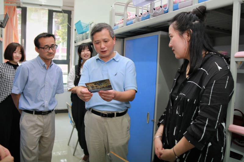 副校长洪大用教授、副校长刘元春教授前往品园六楼205宿舍慰问我院新生。洪校长与6名艺术设计系女同学亲切交流,询问有关住宿、生活等方面情况,并分享了他当年上学住宿的轶事。