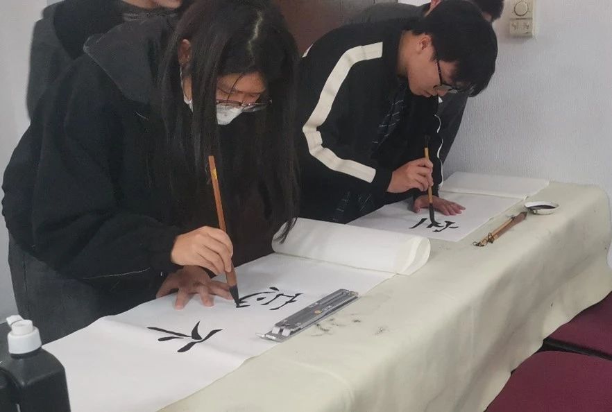 绘画系学生第一党支部书记胡越颖、党员刘欣怡两位同学带领大家进行主题书法创作。