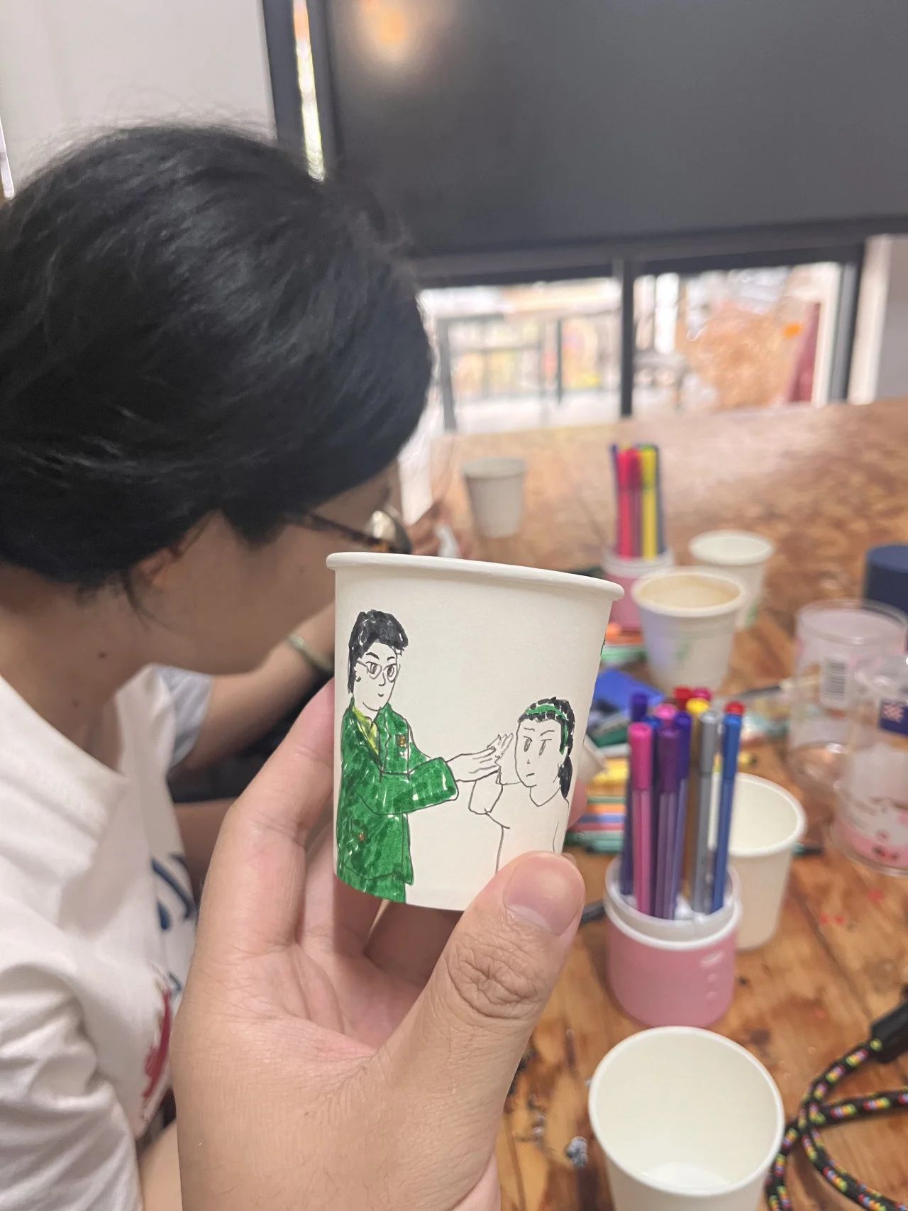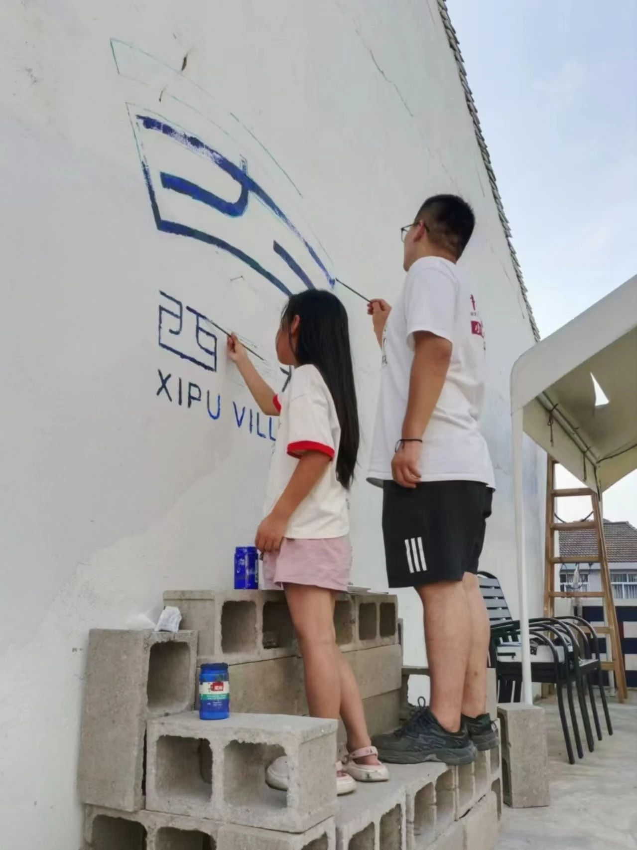 在原有的方案中,花卉植物是方案中最为重要的元素,结合村民经验调整后,汝灏设计的微花园就运用了当地较为常见的空心砖和瓦片,并充分考虑人们“打卡式旅游”的特点,结合墙面制作出能够“打卡+休息”的“花园石椅”,将西圃村的logo画在墙上,并邀请小朋友们一起完成了墙面图案的绘制工作。在老师的指导下,还将整个过程中拍摄的有意思的照片通过手绘的方式呈现在了纸杯上,并将其作为“展品”摆放在“石椅”上,使人们在打卡的同时了解到整个制作的过程,以此来保证在花园内植物较少时,园内其他的组成部分仍然具有独特的观赏价值。