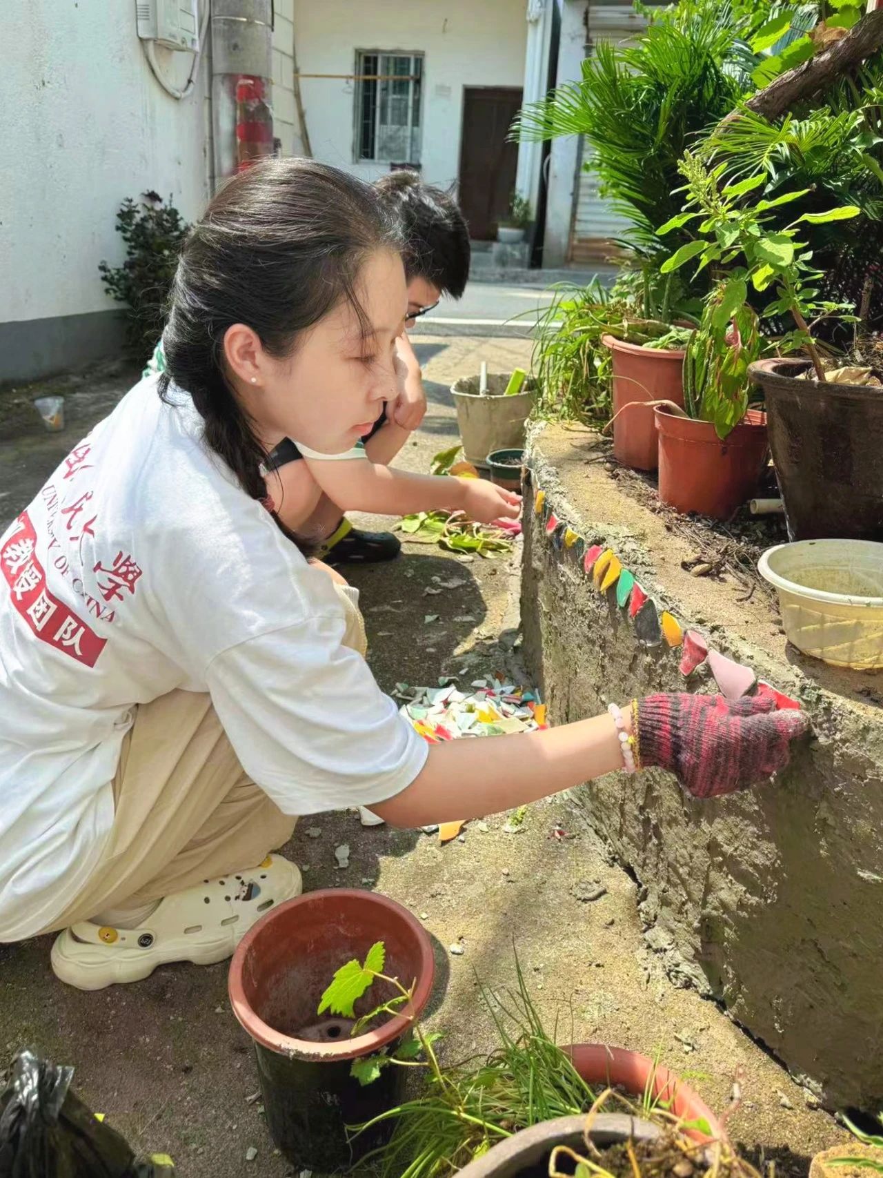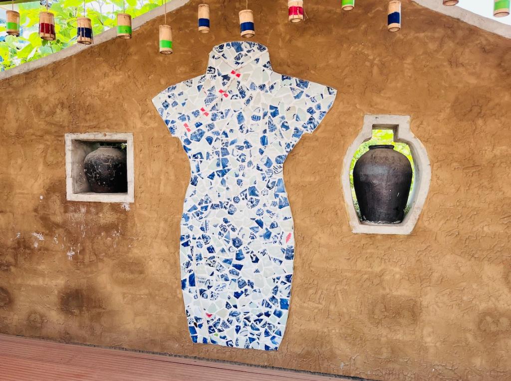 2024年7月,跨越1400公里的距离,即将研一的王艺馨和王汝灏第一次跟随团队来到西圃村,开启了创建“美学角落”的奇妙之旅。从宁波火车站驱车一路向南,穿越高架上游走的蓝天白云,稳稳停在这座曾以制陶闻名的村庄。群山之间,古村之中,藏着团队成员与村民们用碎瓷片共创的充满故事的作品,它们像一个个彩色的精灵,映入两人的眼帘。