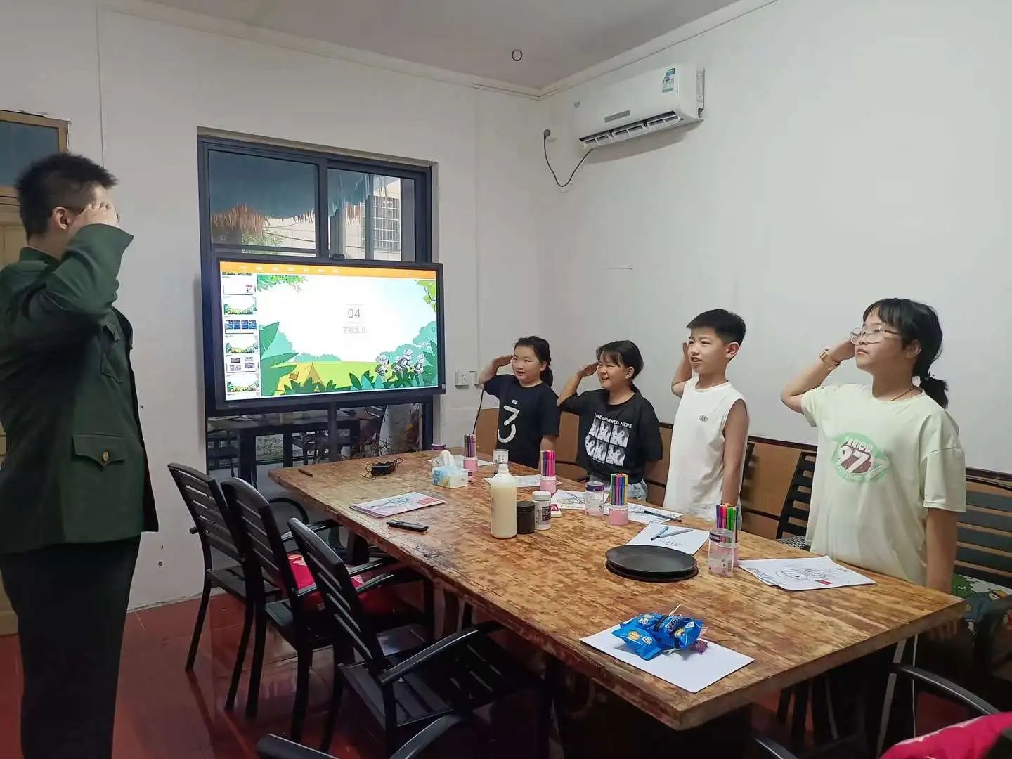在八一建军节这天,作为退役军人的汝灏精心策划了《童心筑梦·荣耀致敬》专题美育课,穿上军装与孩子们重温军史,教他们敬军礼,并带着大家用艺术创作的方式向军人致敬。
