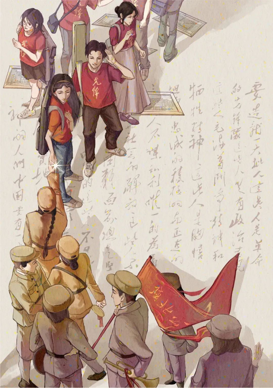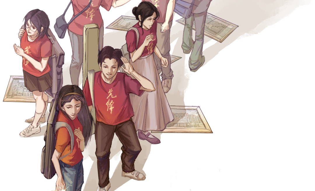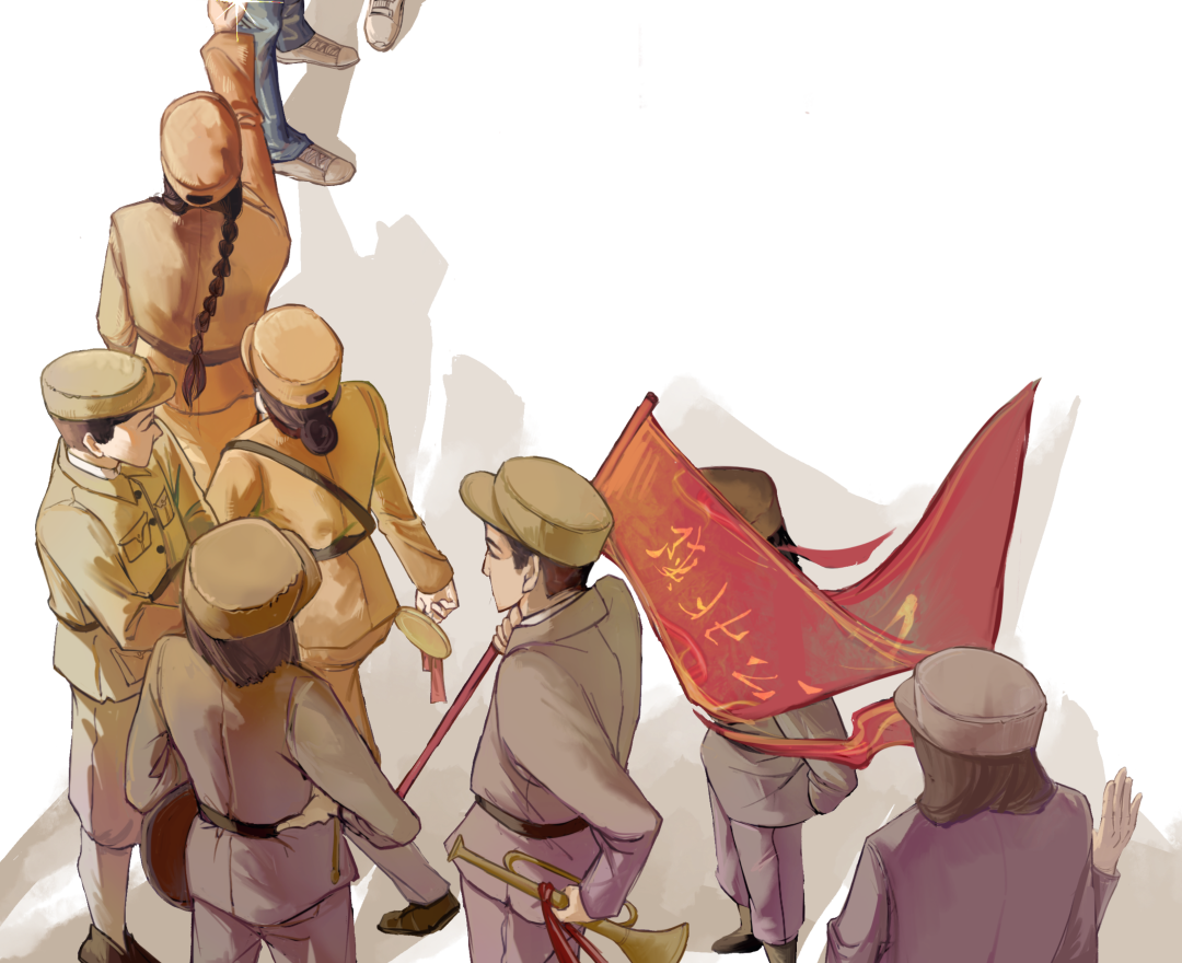 我觉得人大人应该有这样一份精神的传承,跨越时间,画面中心两个人手指间递出的星光就是这份精神的具象表达。画面下方是陕北公学流动剧团团员的背影,上方是我们新时代的先锋青年,画了背画包的女生侧身接过这颗星、男生挥手向他们告别、以及更多人转身离去只能看到脚步,想表现我们接过这份责任,传承这份精神,一定会继续向前走下去。
