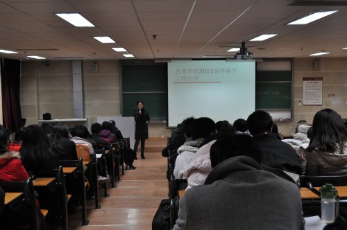 别敏副教授首先对我院2010年就业工作做了简要总结,并根据学校和学院2011年就业工作的相关安排提出了要求和希望。她代表学院希望大家要在严峻的就业形势面前调整好心态,早设计早动手,在投递简历、参加面试以及签订就业协议等方面仔细准备,并期望大家通过努力都能找到一条相对适合自己的人生道路。之后,院团委书记、就业辅导员
