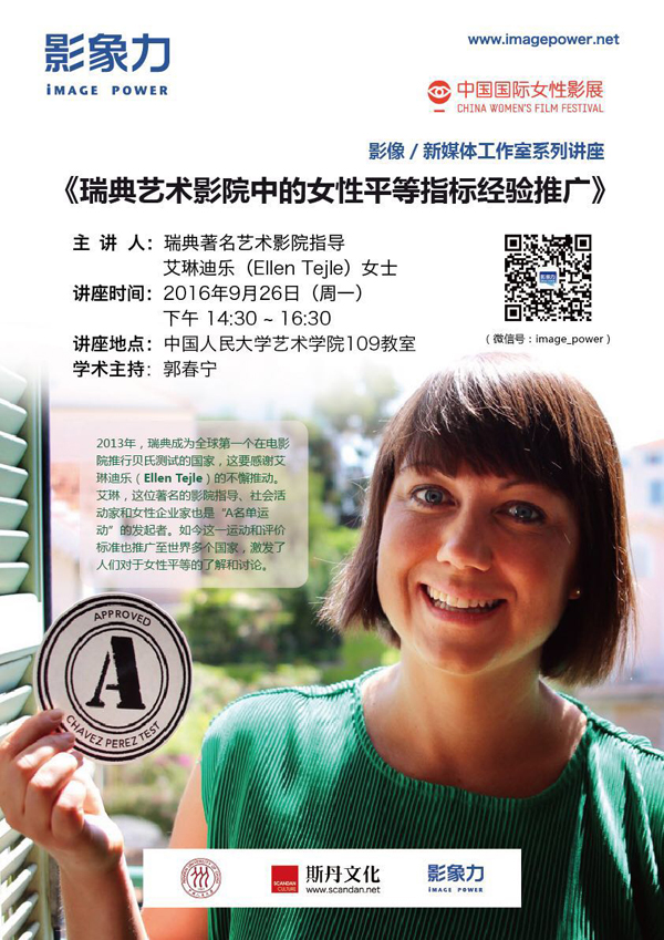 影像/新媒体工作室举办了新学期系列讲座,邀请瑞典著名艺术影院Cinema RIO指导艾琳迪乐(Ellen Tejle)女士,进行《瑞典艺术影院中的女性平等指标经验推广》的主题讲座。此次讲座获得了“影象力”艺术项目的设计支持。