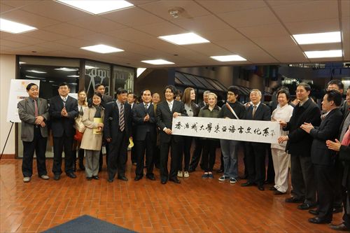 开幕酒会上徐庆平院长代表学院向乔治城大学东亚系同学赠书法学习用品