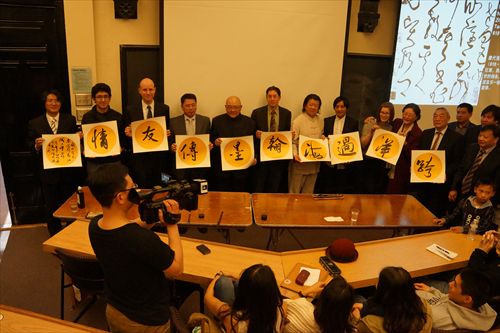 郑晓华教授从前哈佛大学教授、美国著名学者塞缪尔•亨廷顿(Samuel•Huntington)所提出的“文明冲突论”切入,联系中西艺术的不同藝術观念和思想,阐述了中国艺术的特独性及其普遍意义,同时对中国漢字书写為什么能够发展成為一门純藝術做出了解释。报告结束后,徐庆平、郑晓华、吴震启、胡传海和兰干武五位书法家现场挥毫,共同创作了“跨洋过海翰墨传友情”的组合作品。