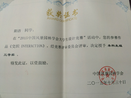 2015年10月,由中国风景园林协会、北京园林学会、中国园林博物馆等单位共同支持主办的“2015中国风景园林学会大学生设计竞赛”获奖名单公布,我系2012级景观建筑专业本科生阳洁同学的作品《交织Interaction》荣获三等奖,李宇宏副教授担任指导老师。