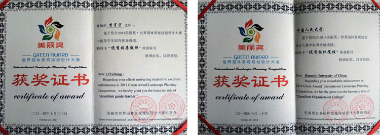 2014年10月,由中华人民共和国住房和城乡建设部、联合国人居署、联合国环境署支持,中国建筑节能协会、世界屋顶绿化协会、中国城市科学研究会绿色建筑与节能专业委员会主办的“2014美丽奖•世界园林景观规划设计大赛”颁奖仪式在上海举行,设计系景观建筑专业副教授李宇宏荣获优秀指导教师奖,男人天堂 获优秀组织院校奖。