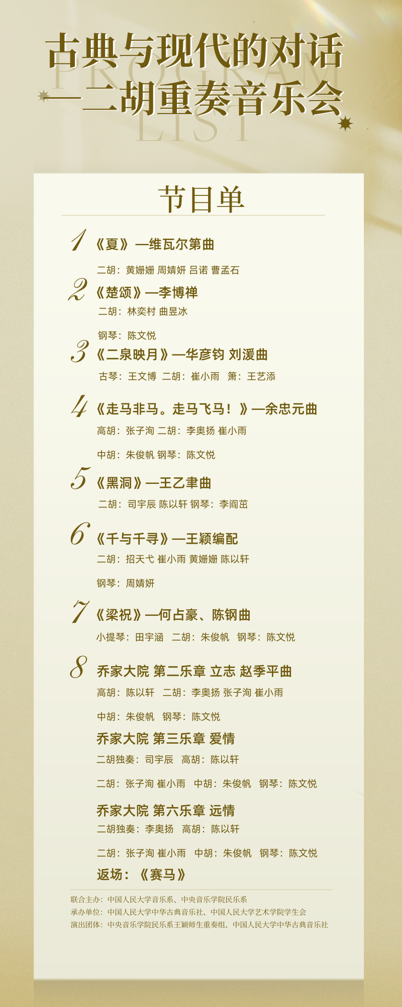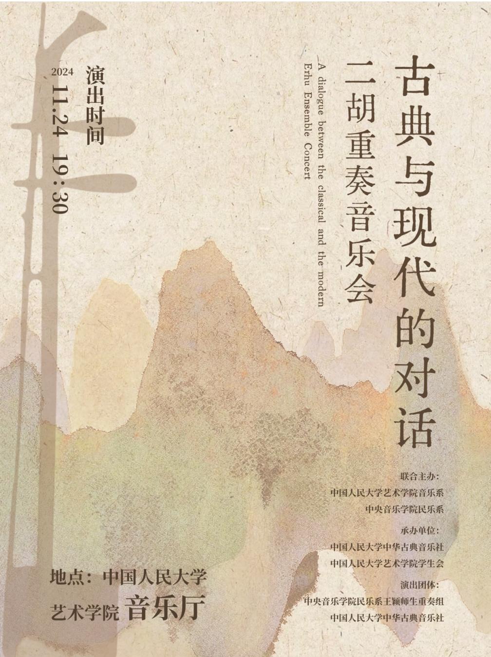 中华古典音乐社与中央音乐学院民乐系青年教师、二胡演奏家王颖带领央音师生共同演绎,选曲涵盖多种风格、不同时期的二胡重奏作品,包括经典曲目、现代创作以及改编作品等,注重与观众的情感共鸣,通过音乐讲述故事、传递情感。