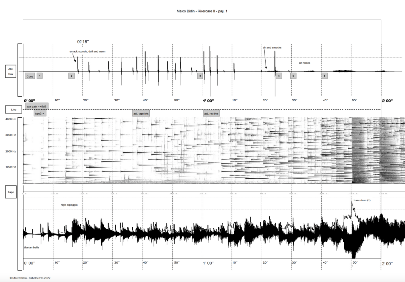 Bidin从谱面与可视化谈起。他指出,混合音乐最常见的困境并不在“声部数量”或“设备堆叠”,而在于演奏者如何在庞杂电子织体中找到与之同步、并与之对话的“入口”。传统的复杂比例记谱(如7:16、8:9:32等)或许忠实,但在排练与演出中往往成为“数拍子的迷宫”。为此,他主张以视觉化谱面替代对可执行性不友好的精密比例:在谱面上标注能量、音色与密度的变化轨迹,用幅度—时间曲线和频谱颜色的连续变化,给演奏者提供稳定的时间锚点与音色线索。演奏者不再被迫在抽象拍号里数拍子,而是把注意力拉回到聆听与互动。