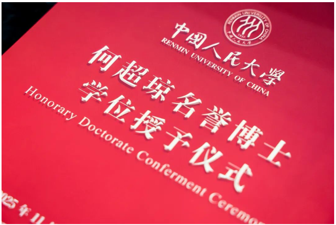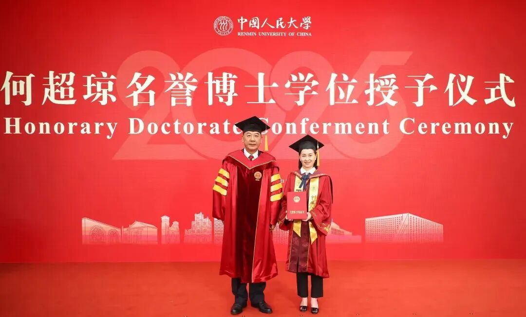 有着光荣的办学传统和红色基因、优秀的艺术教育传统和学科基础,名誉博士不仅是学术桂冠,更承载着“让党放心、不负人民”的精神品格、“独树一帜、勇走新路”的高远追求和“扎根中国、胸怀人类”的世界情怀。授予何超琼女士名誉博士学位不仅是对她卓越成就的崇高致敬,更是对她与人民大学“精神同频、价值共振”的高度认同。期待与何超琼女士及港澳各界同仁一道,坚持为国育才之本、拓展文明交流之界、紧跟国家战略之需,学习好贯彻好党的二十届四中全会精神,为全面建成社会主义现代化强国、实现第二个百年奋斗目标贡献教育力量、知识力量、人才力量。